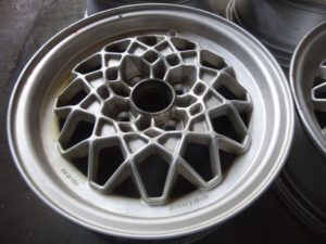 古いBBSアルミホイール、経年劣化でサビ、色褪せが酷くレストアで新品並に修復します。