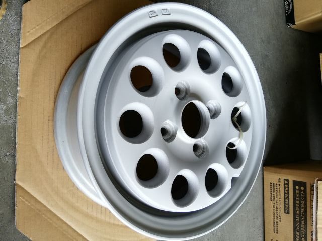 粉体塗装⇒新品と同工程。粉体でホイール全体を覆いサビの発生を防ぎます。 密着力・耐久力・防錆性バツグン!!